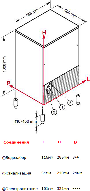 To install the equipment required at a distance of 70 cm from walls or other devices to ensure constant air circulation, necessary for the proper operation of the unit. Monitoring the state of the nozzles, providing spray fluid to the evaporator of the ice machine is achieved through technology "sprayers system". This system allows you to replace the nozzles to form on them lime.