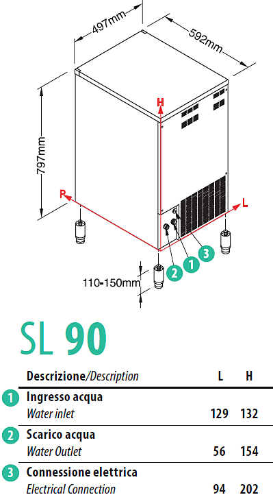 For installation of the ice machine required hose (valve 3/4") and discharge cold water (drain Ø 24 mm). The housing is made of stainless steel.