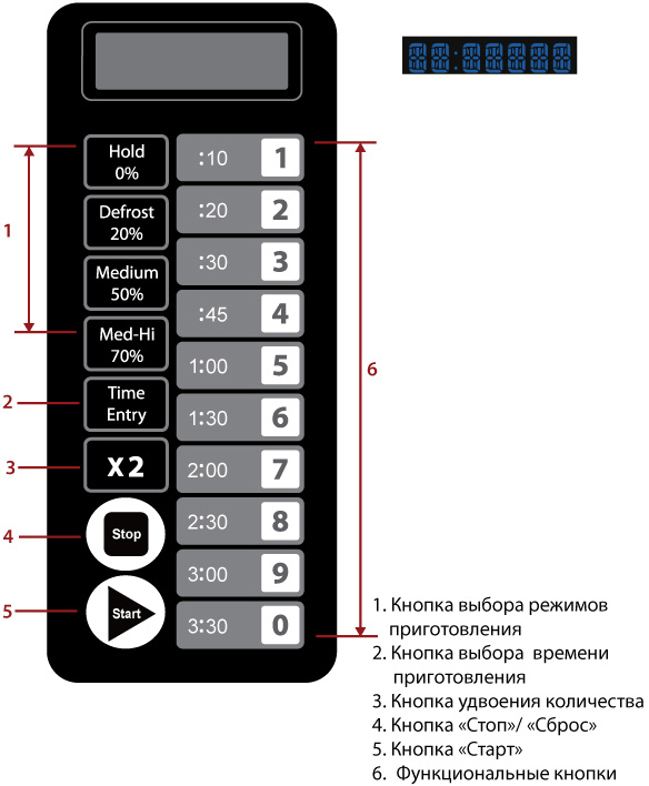10 функциональных кнопок приготовления на 100% мощности в различные временные интервалы от 10 секунд до 3 минут 30 секунд