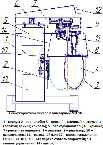 Planetary mixer for the food and trade,Belarus MP-10 is designed for kneading dough of different consistency, as well as for whipping cream, mixing mousses and purees, sauces and pastes in the food industry and public catering, bakeries and confectionery. The base of the mixer is painted with paint non-scratch. The bowl and kneading elements are made of stainless steel