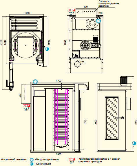 Oven is dismantled into 2 parts with a minimum width of 680 mm, which allows you to place it in a doorway width of 700 mm Must be connected to the water supply, Sewerage, electricity and ventilation.