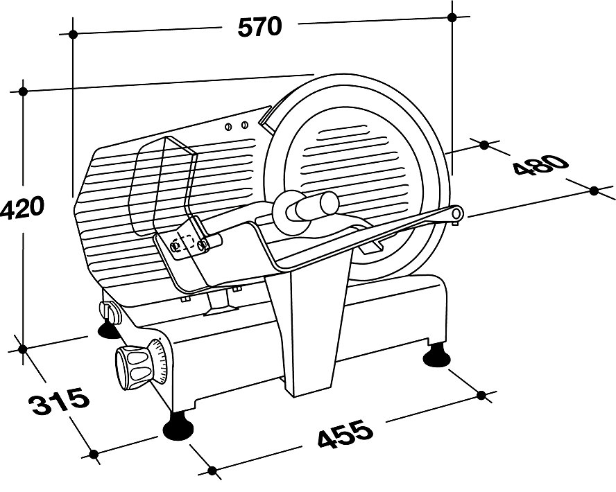 Professional motor with forced-ventilation eliminates the possibility of overheating of equipment, and also makes it virtually silent. The slicer is equipped with a removable device for sharpening knife with double emery. Tray products, jumper for adjusting the slice thickness, ring covering the blade and holder products made of aluminium, polished by the anodic coating, which ensures hygienic cleanliness and protection against corrosion.