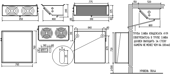 - Компрессорно-конденсаторный блок монтируется снаружи на стене камеры, а воздухоохладитель на потолке внутри камеры