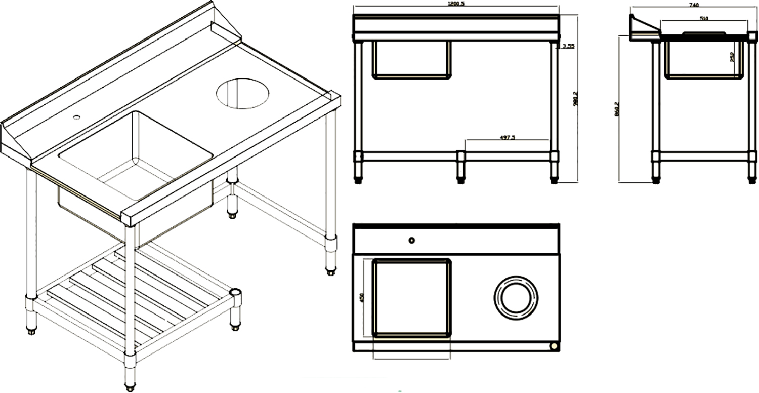 The table-sink with shower Kocateq WD2AP (DX) is designed in the kitchens of public catering enterprises for sorting and pre-rinsing of dishes placed in the cassette. Dishes after sorting and rinsing moves in a dome car. The model is equipped with a sink on the left, a place to put trash can under the hole for waste and is made of stainless steel AISI 304.