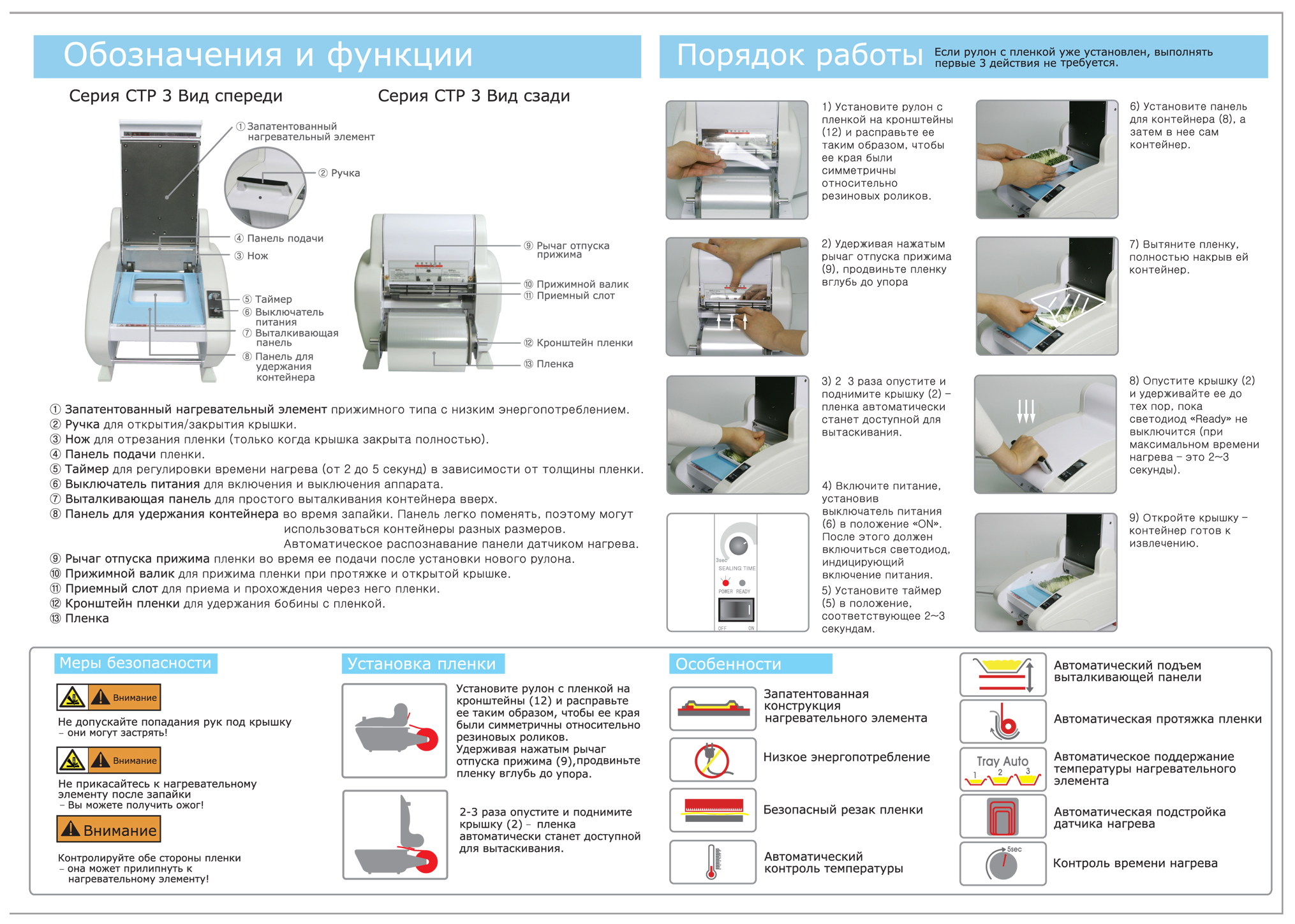 The tray sealer CAS-CTP-320 (Q14) is used at the enterprises of public catering and trade to seal the packaging film is PET material 99% Silica and 1% in plastic container ready, frozen, chilled and non-food products. The model is equipped with automatic temperature control, built-in knife for cutting the foil along the contour and patented design of the heating element.